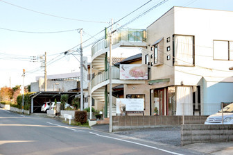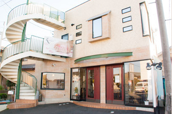らせん階段のある白い建物が目印です。